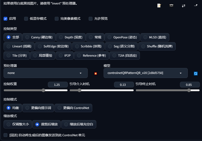 - 使用QR Toolkit生成二维码,sd插件:sd-webui-qrcode-toolkit,直接扩展安装。独立网址:https://qrcode.antfu.me
