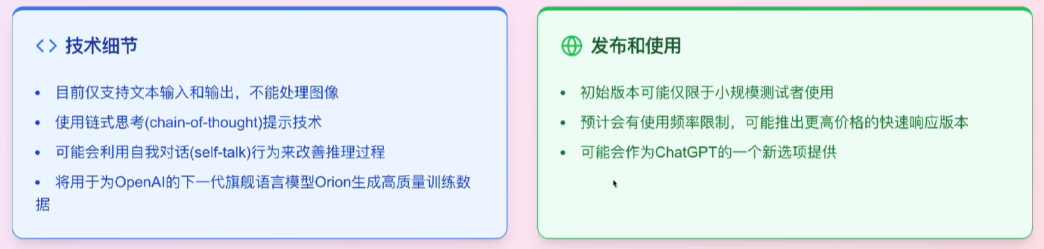 - 思维链COT提示技术:草莓模型使用的是思维链COT的提示技术,目前仅支持细文本输入和输出,不能处理图像。
